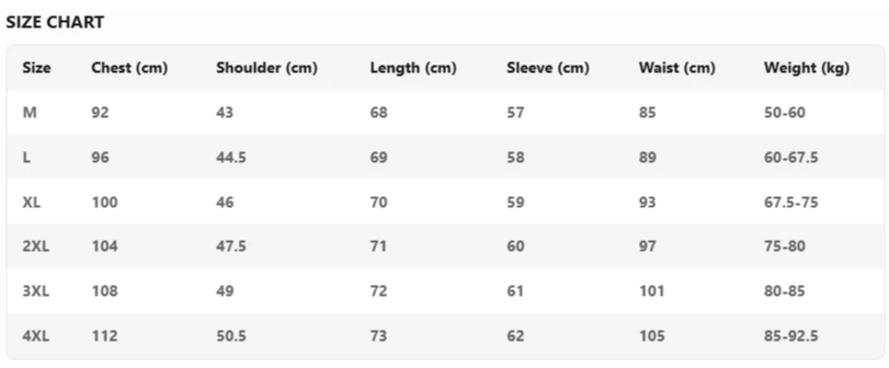 size_info: {"sizeInfoList":[{"length":{"cm":"92","inch":"36.22"},"size":"M -fits 50-60kg","vid":-1},{"length":{"cm":"96","inch":"37.80"},"size":"L -fits 60-67kg","vid":-2},{"length":{"cm":"100","inch":"39.37"},"size":"XL -fits 67-75kg","vid":-3},{"length":{"cm":"104","inch":"40.94"},"size":"XXL -fits 75-80kg","vid":-4},{"length":{"cm":"108","inch":"42.52"},"size":"3XL -fits 80-85kg","vid":-5},{"length":{"cm":"112","inch":"44.09"},"size":"4XL -fits 85-92kg","vid":-6}]}